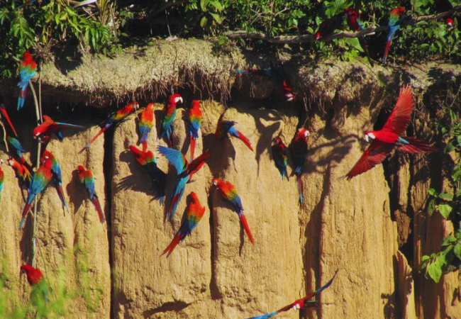 - Muy temprano, partiremos hacia la collpa de loros y guacamayos, donde cientos de aves de colores se reúnen cada mañana para alimentarse de arcilla mineral, creando un espectáculo natural único en el mundo.